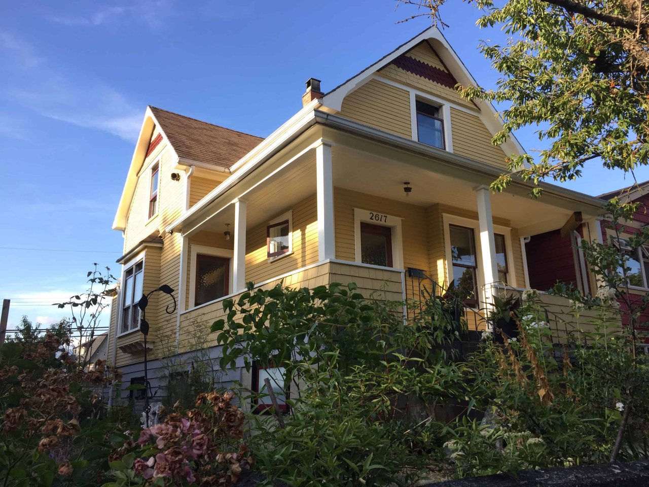 The house at 2617 Pandora Street is one of at least four structures built on three adjoining lots on the northwest corner of Pandora and Penticton Streets (formerly Clinton St) between 1908 and 1912 by Scotsman, William Michael McGavin, the local post-master and grocer. In 1908 he built a 2 storey corner store/butcher shop and post office with apartments above called ‘Clinton Grocery’. William’s brother was the owner of McGavin’s bread, which you can still find today in local stores, and McGavin Bread Basket stores around Metro Vancouver. In 2018, the homeowners restored the exterior using Kitsilano Gold, with Hastings Red accents from the Vancouver Heritage Foundation’s True Colours Palette.